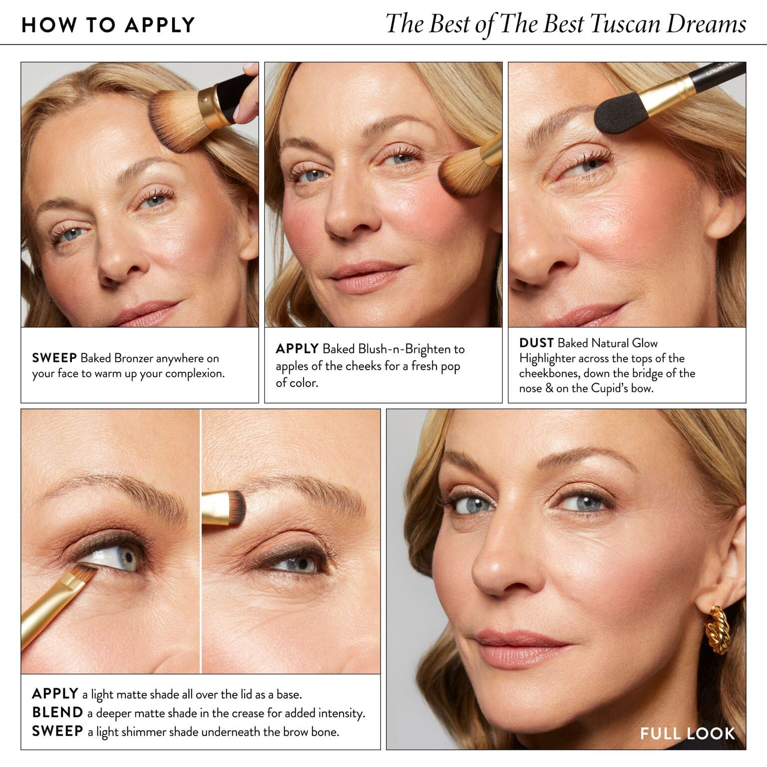 It’s time for your bake-over! This palette features a stunning assortment of our bestselling Italian-made baked products. all inspired by a Tuscan getaway. It includes six luxurious baked eyeshadows. Baked Bronze-n-Brighten in Roman Holiday. Baked Natural Glow Highlighter in French Vanilla and Baked Blush-n-Brighten in Starfish Island. Each versatile shade is highly pigmented to sculpt. define and enhance for flawless. all-day wear.